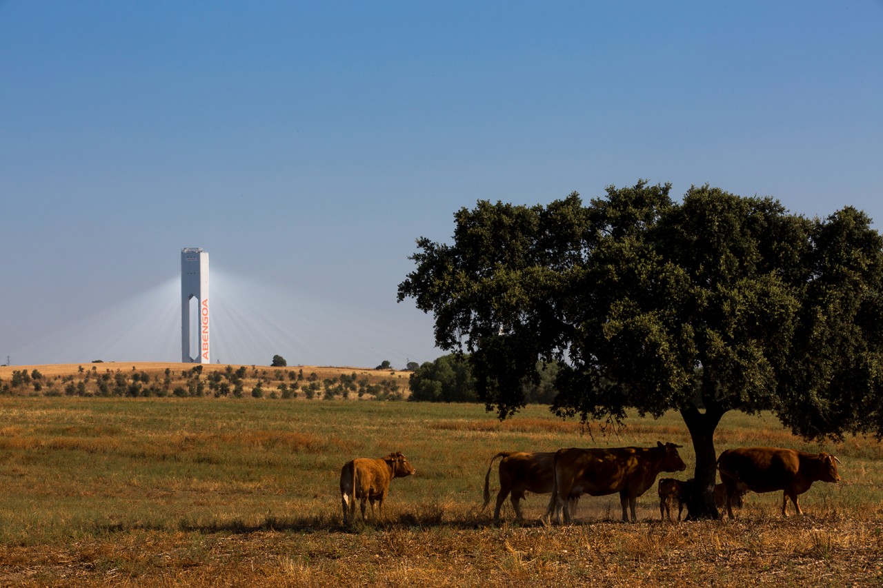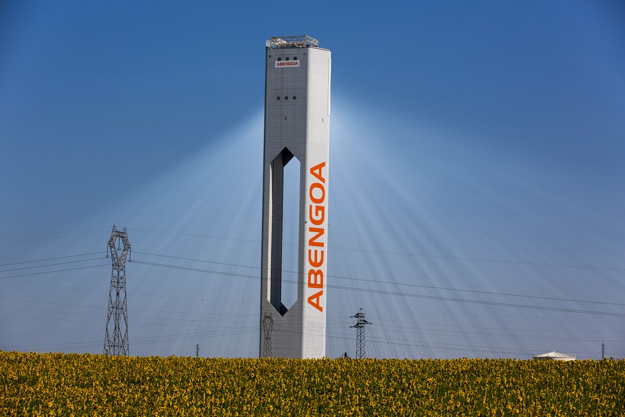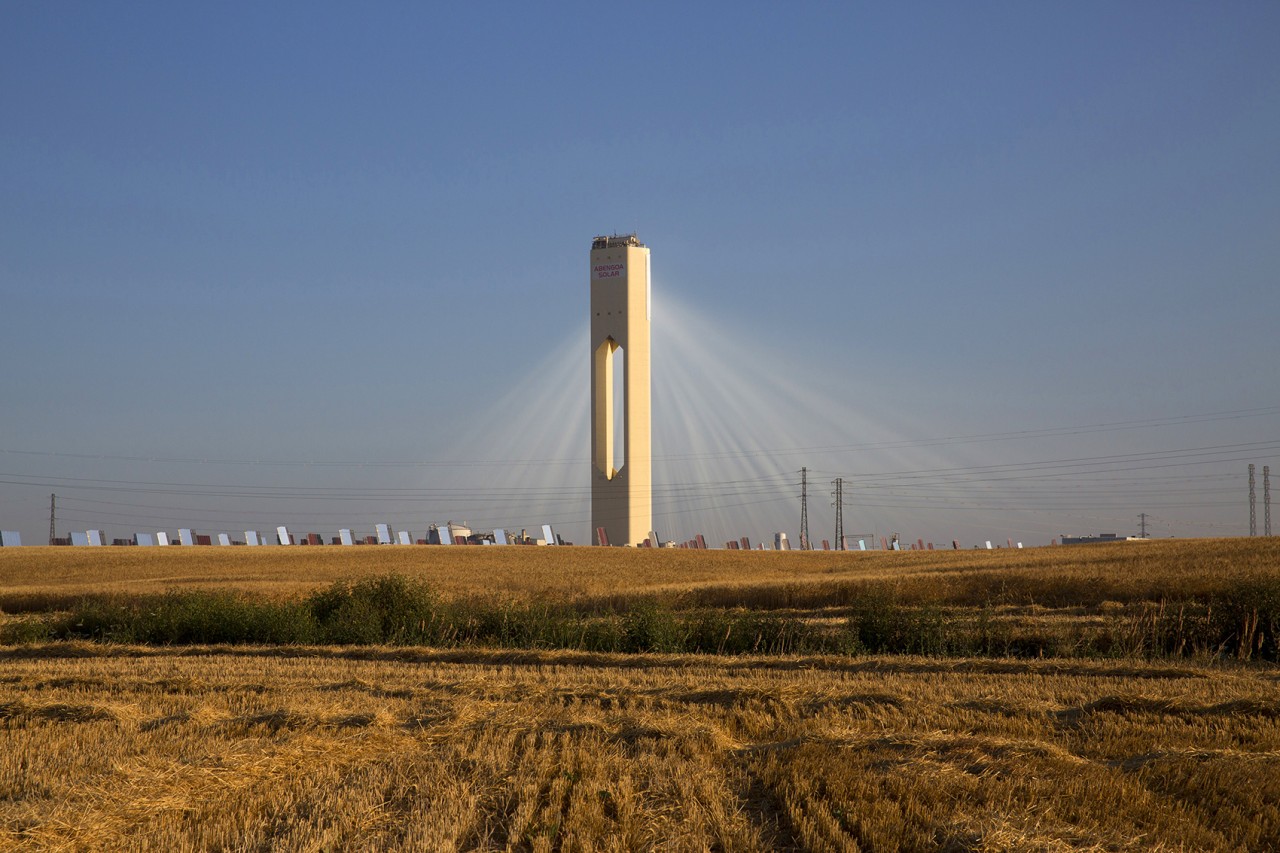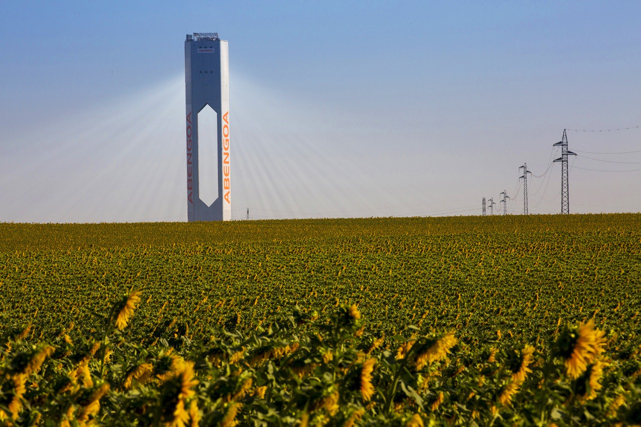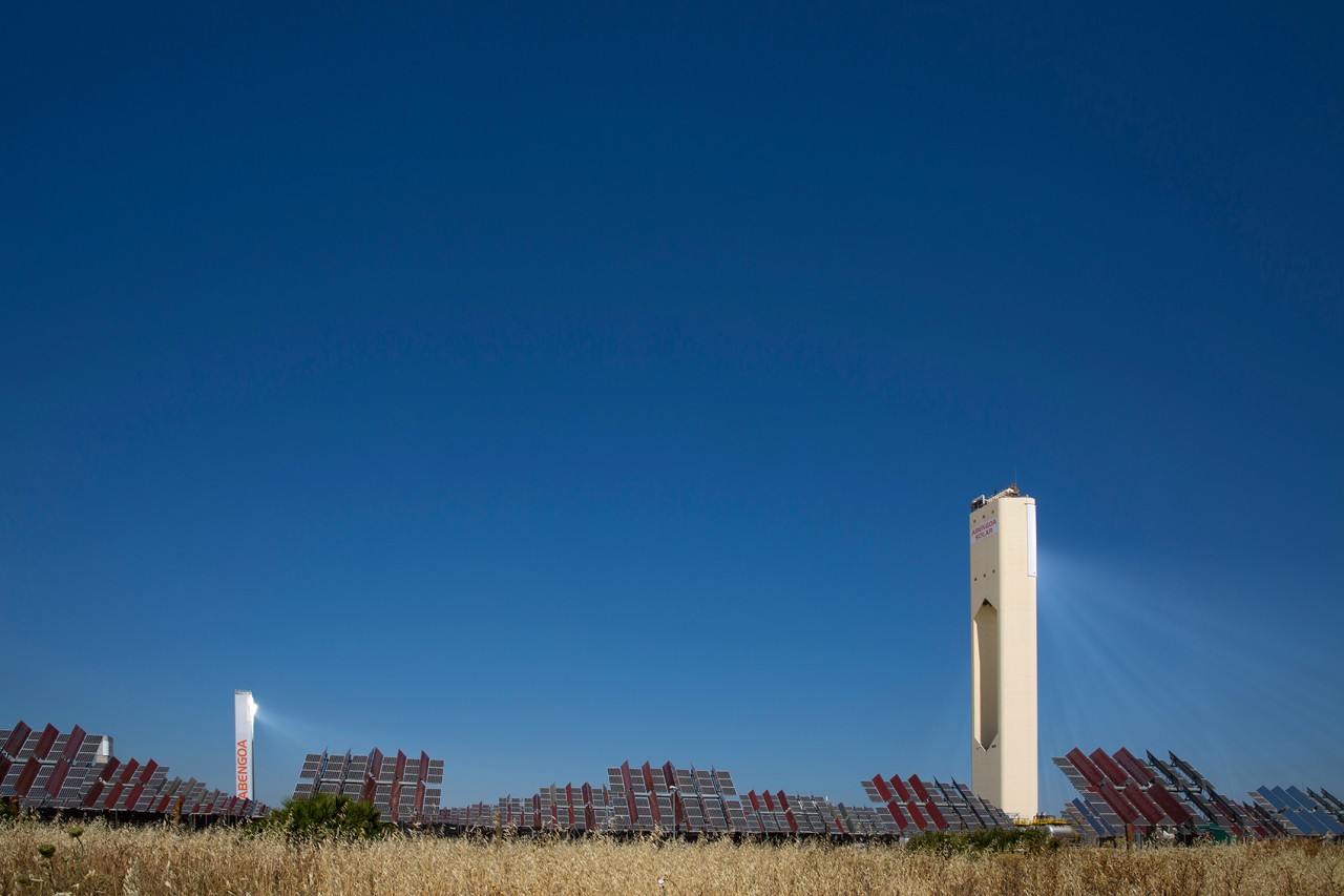 Abengoa’s solar towers in Sanlucar La Major, near Seville, Spain, capture solar radiation using a set of dual-axis mirrors. By tracking the sun they concentrate reflected sunlight onto heat exchangers in the tower’s top. The steam produced drives turbines to generate 20 MW of electricity, enough to power 10,000 homes.