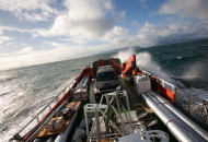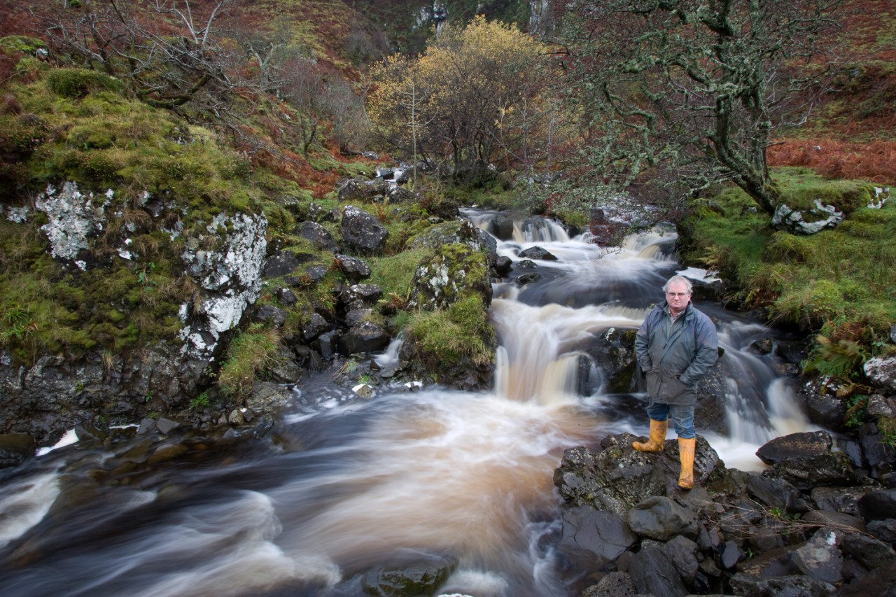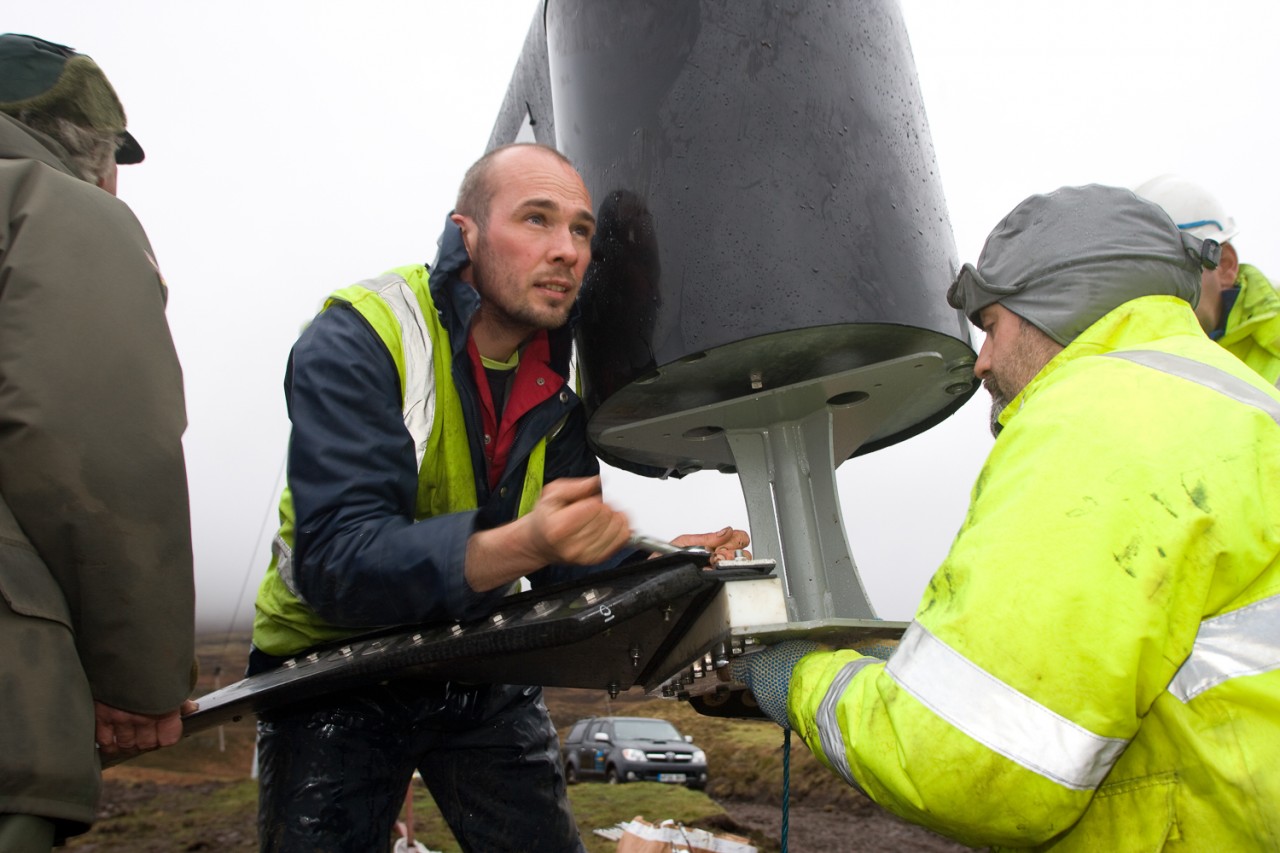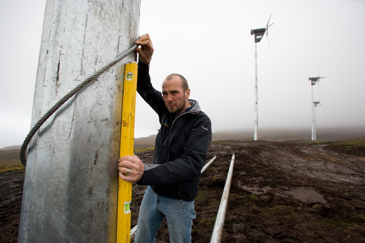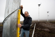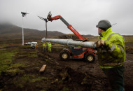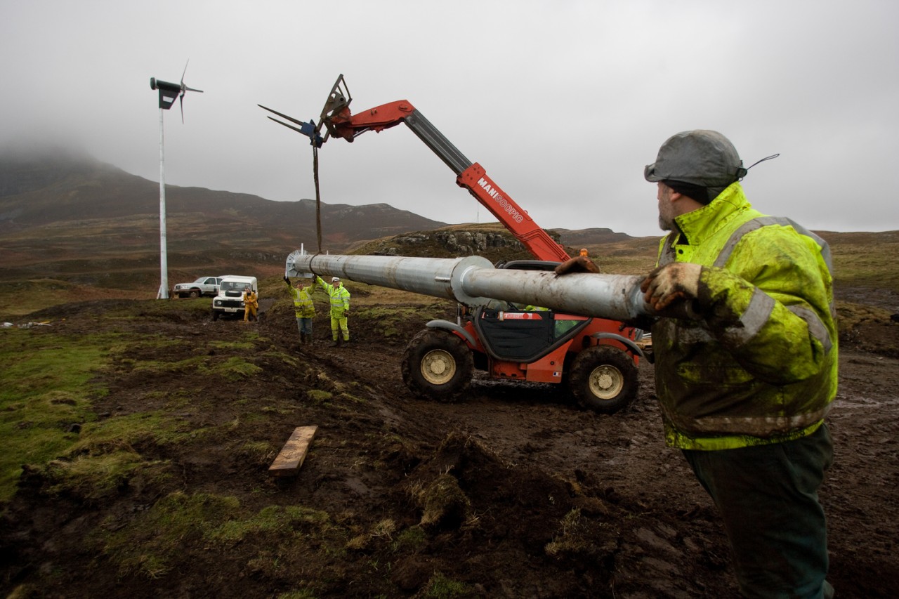 The buyout changed the island’s fortunes. Eigg’s population increased and employment prospects improved – but the lack of a constant electricity supply held back development. Eigg Electric Ltd devised an island electrification scheme based on renewable energy. When conractors Energy Renewed arrived on Eigg in November 2007 to erect the four wind turbines, the last element in the project, harsh autumn weather hampered progress turning the site into a sea of mud. With high rainfall, hydro provides the backbone of the island’s renewable energy.