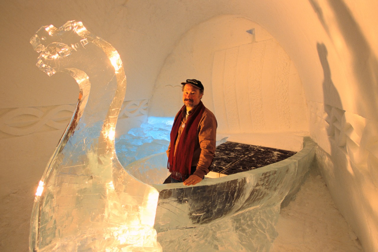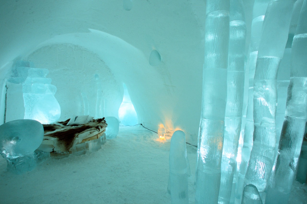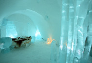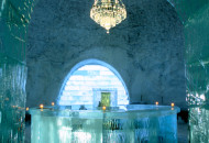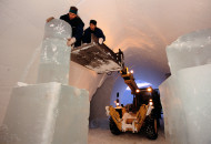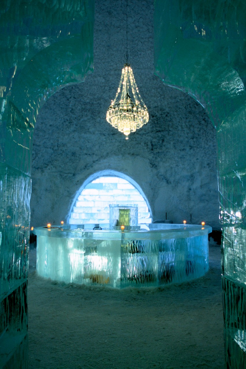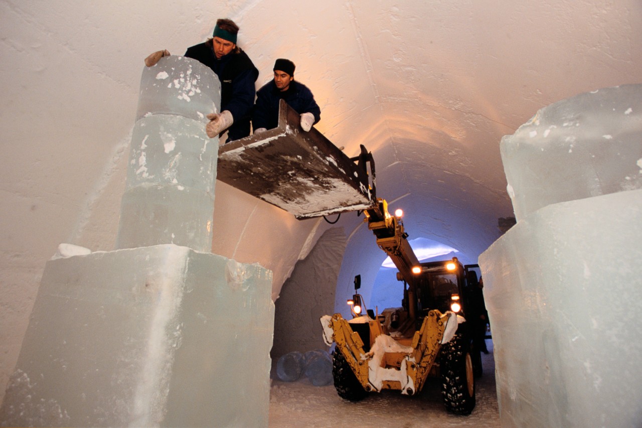 In Sweden, 200 km north of the Arctic Circle on the banks of the Torne River, building work starts each November on the construction of the Ice Hotel. Using snow canons and heavy equipment snow is moulded over vaulted steel forms that are removed two days later once the snow and ice have set. A complex of rooms and suites is made in this way then given over to sculptors to create unique environments.